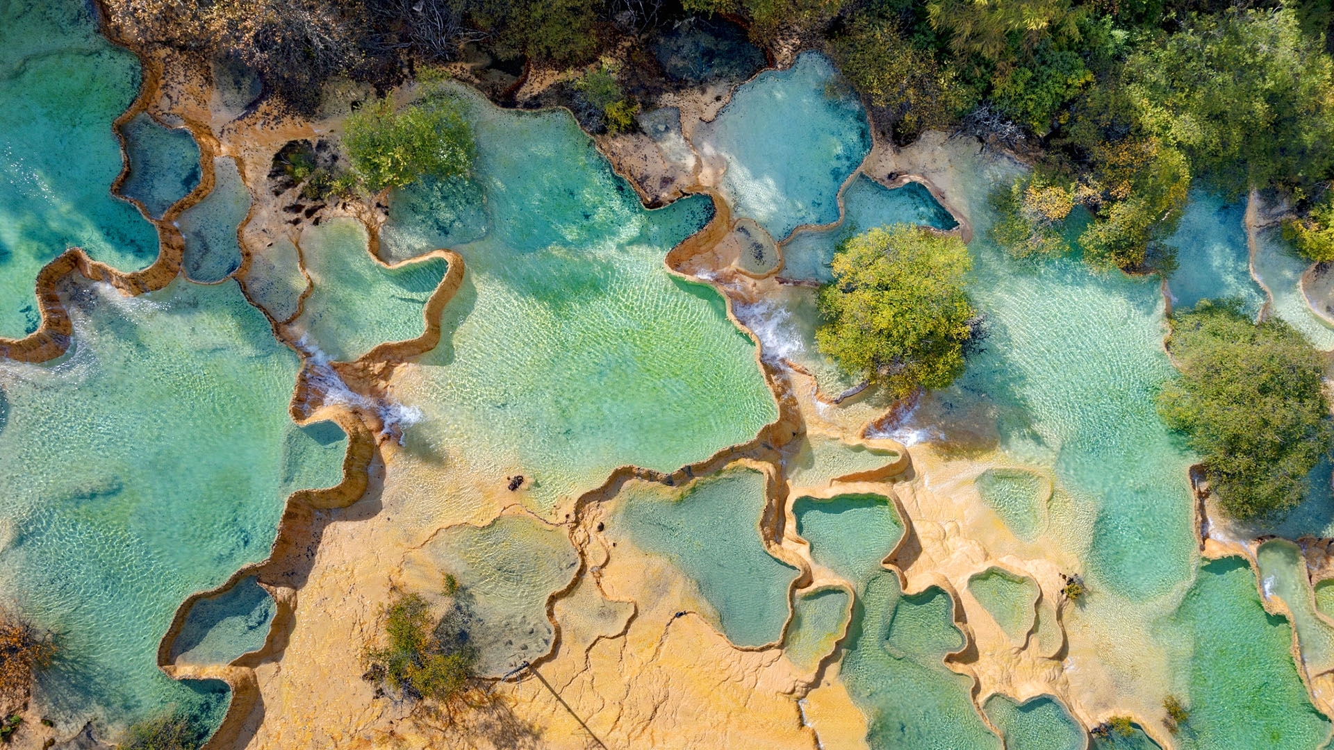 On September 28, 2021, the Huanglong Scenic and Historic Interest Area in Songpan County of southwest China's Sichuan Province welcomed a sunny autumn day. As a UNESCO World Heritage site, it is known for its magnificent colorful water pools. These water pools are made of travertine, a form of limestone often deposited in hot springs. The water displays different colors based on the elements and algae in the water, as well as light absorption and reflection.
