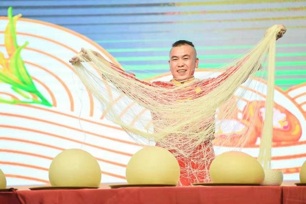 A chef demonstrates his noodles during the 2021 World Pasta Industry Development Conference in Datong, Shanxi province on Friday. [Photo provided to China Daily]