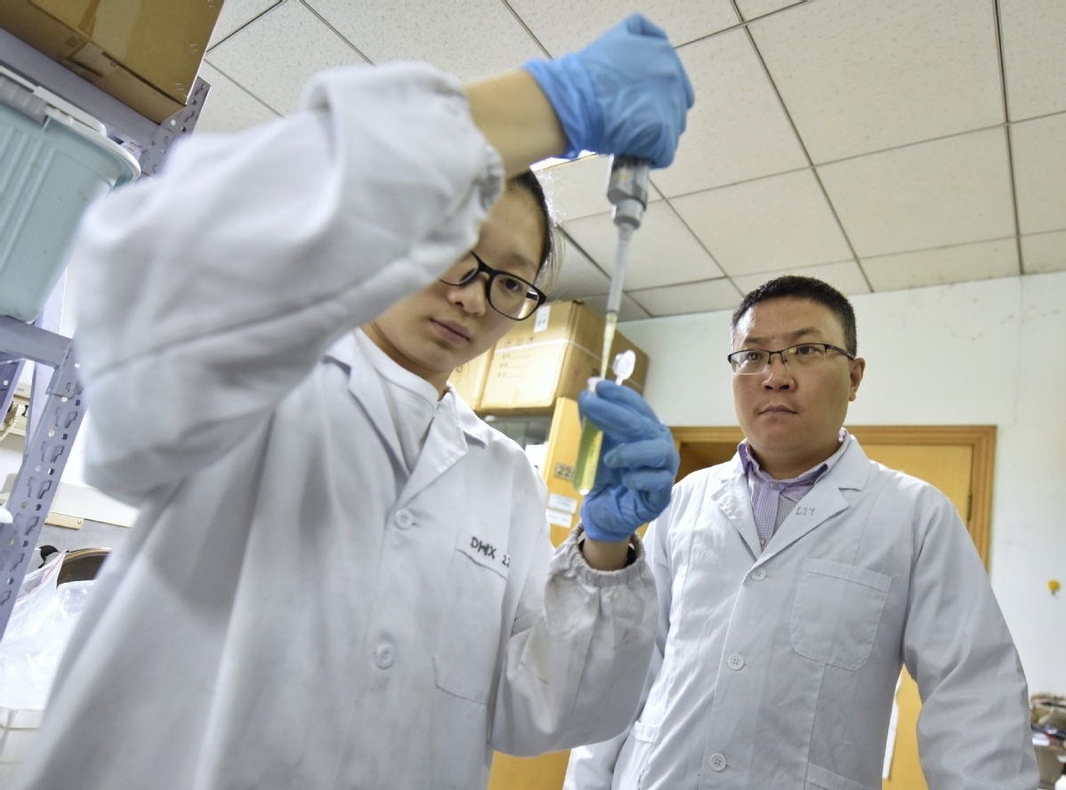 A researcher (right) and his assistant wait for test results of organic waste resources at a unit of the Chinese Academy of Sciences in Chengdu, Sichuan province, in June. [Photo/Xinhua]