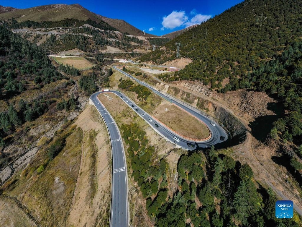 Aerial photo taken on Oct. 23, 2021 shows the winding road in Batang County, Tibetan Autonomous Prefecture of Garze, southwest China's Sichuan Province. (Xinhua/Liu Kun)