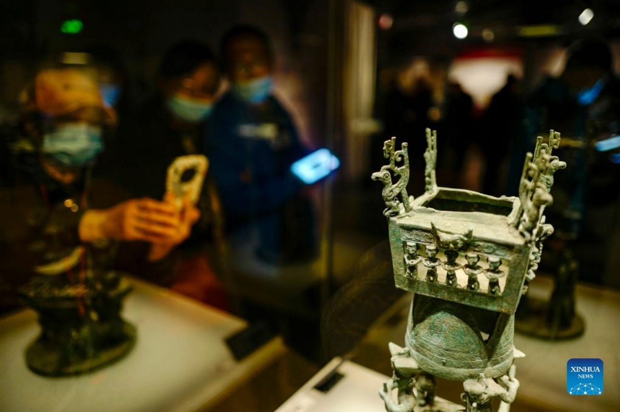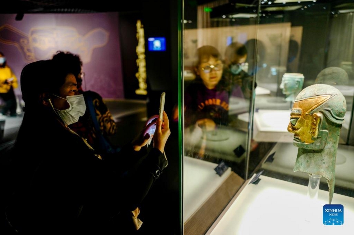 Visitors look at exhibits at Sanxingdui Museum in Guanghan, southwest China's Sichuan Province, Oct. 29, 2021. Sanxingdui Museum displayed a batch of new finds at the legendary Sanxingdui Ruins site in southwest China's Sichuan Province. (Xinhua/Liu Chan)