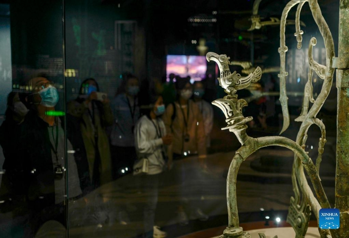 Visitors look at an exhibit at Sanxingdui Museum in Guanghan, southwest China's Sichuan Province, Oct. 29, 2021. Sanxingdui Museum displayed a batch of new finds at the legendary Sanxingdui Ruins site in southwest China's Sichuan Province. (Xinhua/Liu Chan)