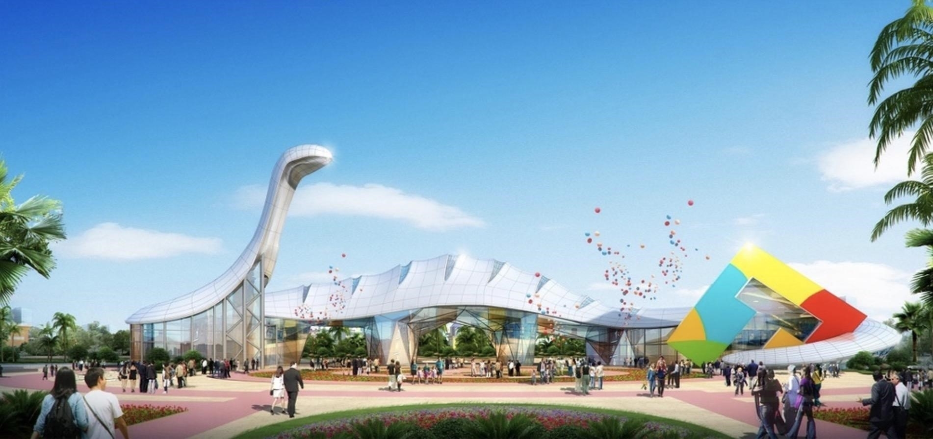 Its visitor center is the landmark of the project. In the shape of Mamenchisaurus Youngi (a sauropod dinosaur known for their remarkably long necks and the most representative dinosaur genus in Zigong), it is located on the central axis of the avenue. There are three commercial buildings on both sides of the road with styles of the ocean, forest, and cave, including food stalls, theme hotels, malls, souvenir shops, etc.