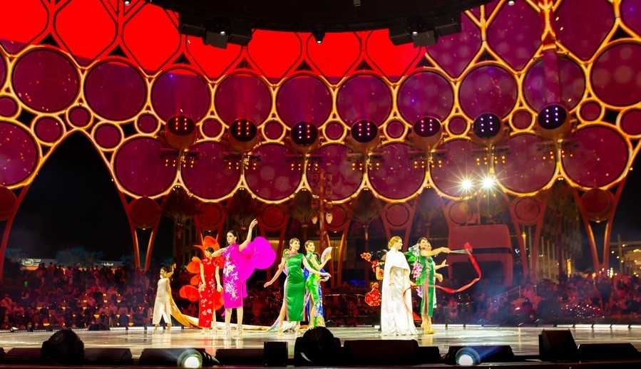Models standon the center stage in Al Wasl Plaza, located at the center of the Expo 2020 Dubai, during fashion gala featuring Chinese qipao on Jan. 10, 2022.(Xinhua photo)