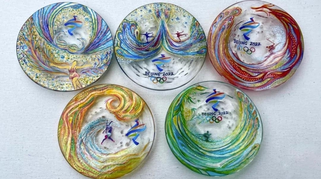 这组玻璃画以“凤归故里 煌耀冬奥”为主题,画在直径10厘米的圆盘上,一共五幅,组合在一起象征着奥运五环。