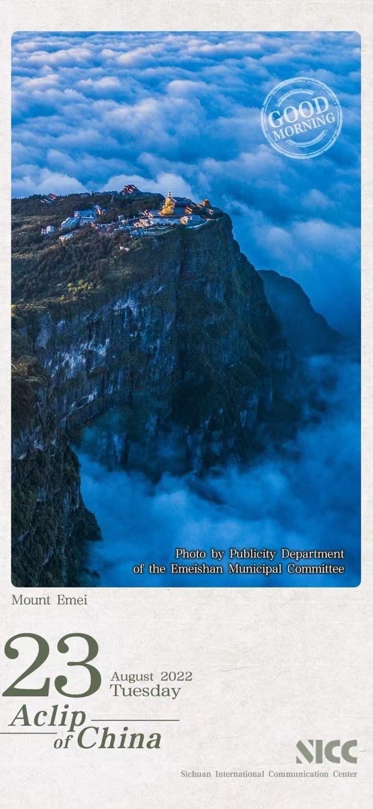 Mount Emei is located in the southwest of Sichuan Province, and is one of the famous Buddhist mountains in China. The poet Li Bai left many poems for it, such as "The moon of Mount Emei is half a wheel of autumn, and the shadow of the mountain flows into the Pingqiang River".