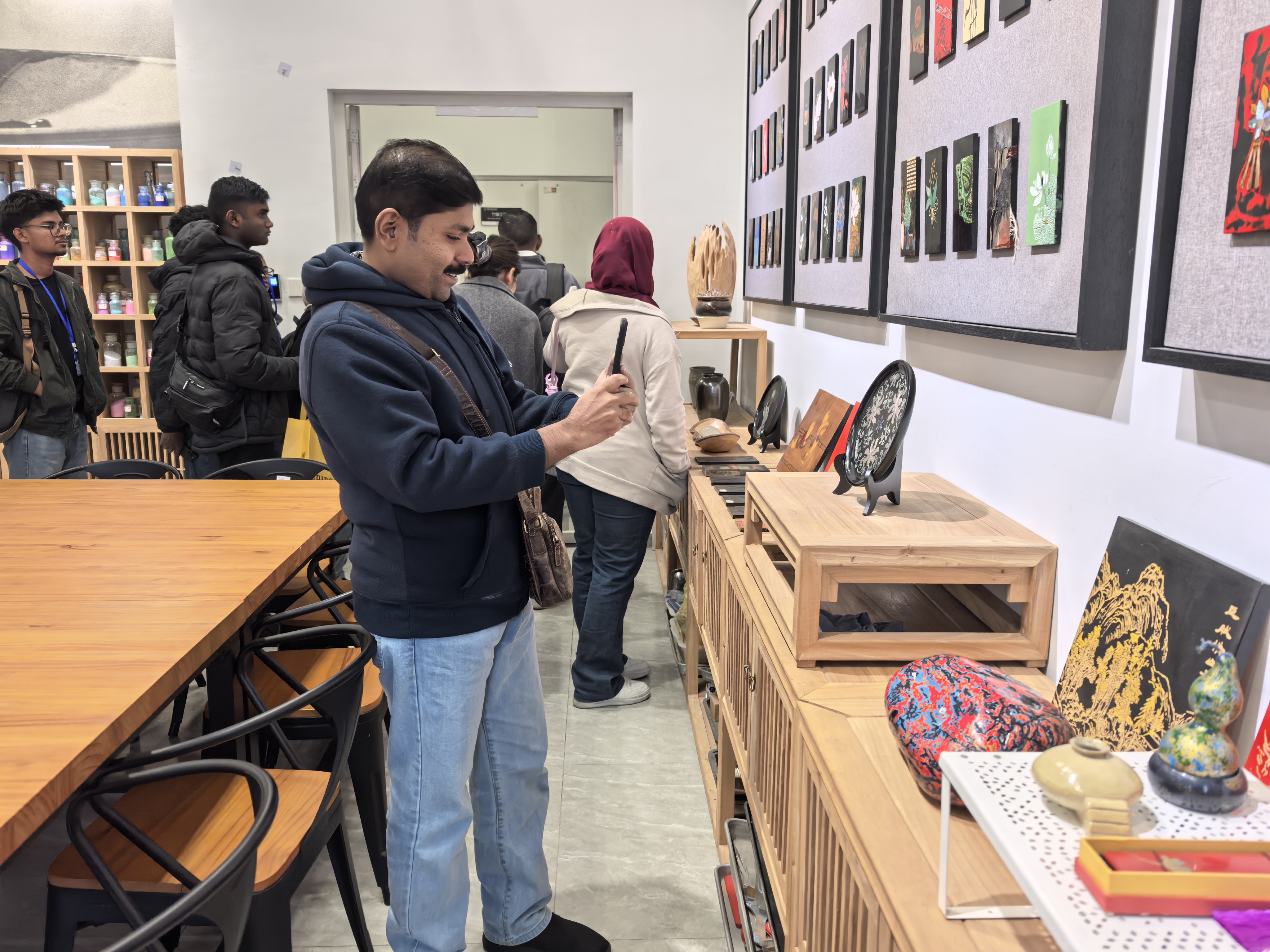 The delegation visited the art center, traditional craft research institute, fine arts department, and international affairs office, where they toured the college's facilities and learned about Sichuan's history, culture, urban development through detailed explanations. They also entered various handicraft workshops to appreciate traditional Chinese crafts such as lacquer art, shadow puppetry, tie-dyeing, bamboo weaving, and pottery. The exquisite artworks and the unique traditional craftsmanship left the delegation in awe. Following this, they held a discussion with Chinese students and international students, fostering mutual understanding and building friendships among the youth from both sides.