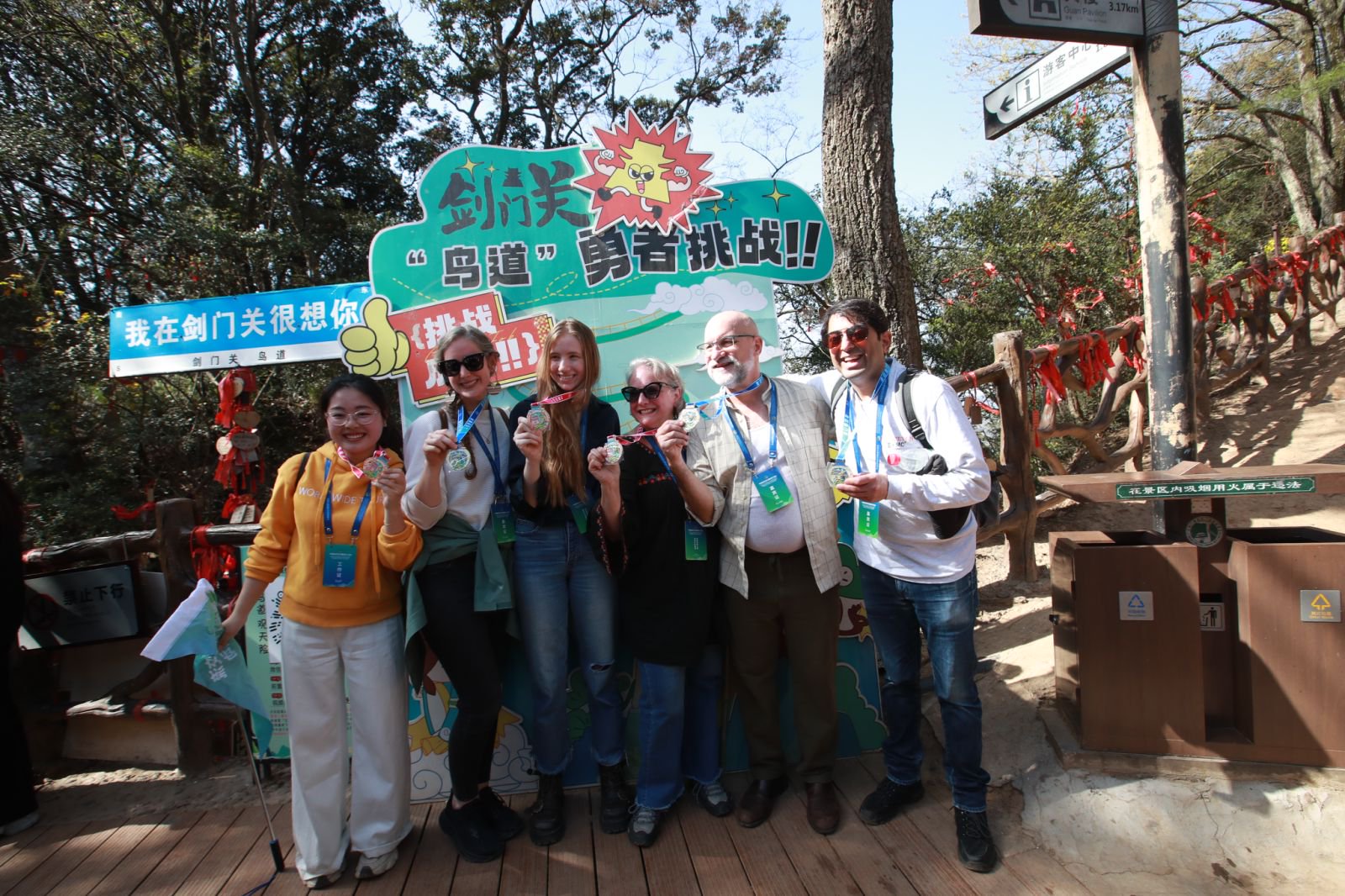 On the Bird Path of Jianmen Pass, visitors climbed carefully, gripping iron chains – leaning forward at times, pausing in awe at others – encouraging and supporting one another along the way. Beneath them loomed sheer cliffs; before them, mist drifted across the mountains. Expressions of amazement accompanied every step, as all were struck by the ingenuity of those who carved paths through such formidable terrain. Upon reaching the summit, participants received commemorative medals, their faces lit with exhilaration and joy. Amid a flurry of camera clicks, several young visitors recited Li Bai’s Hard is the Road to Shu, their voices echoing with poetic passion across the valley.